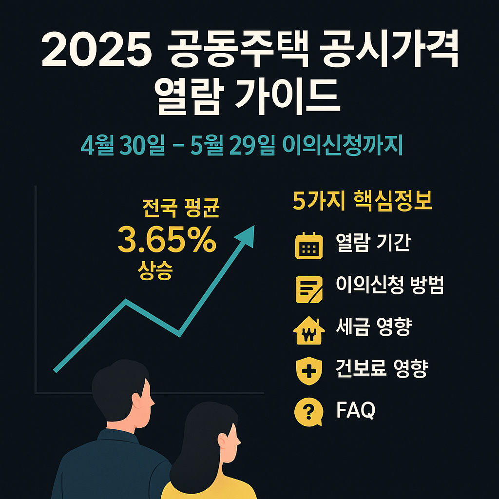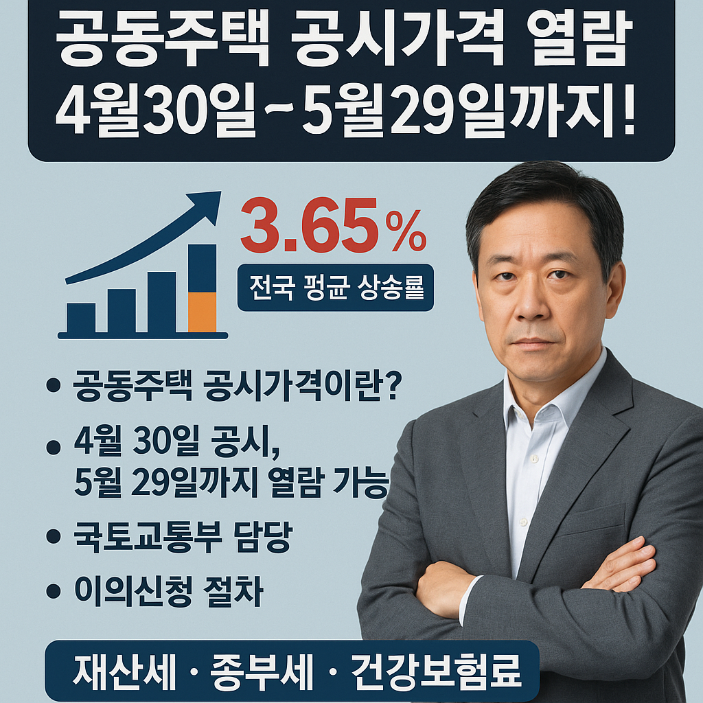 2025년 공동주택 공시가격은 전국 평균 3.65% 상승했으며, 4월 30일부터 5월 29일까지 열람 및 이의신청이 가능합니다. 공시가격은 재산세, 종합부동산세, 건강보험료 등 다양한 세금과 부담금의 기준이 되므로 반드시 확인해야 합니다.