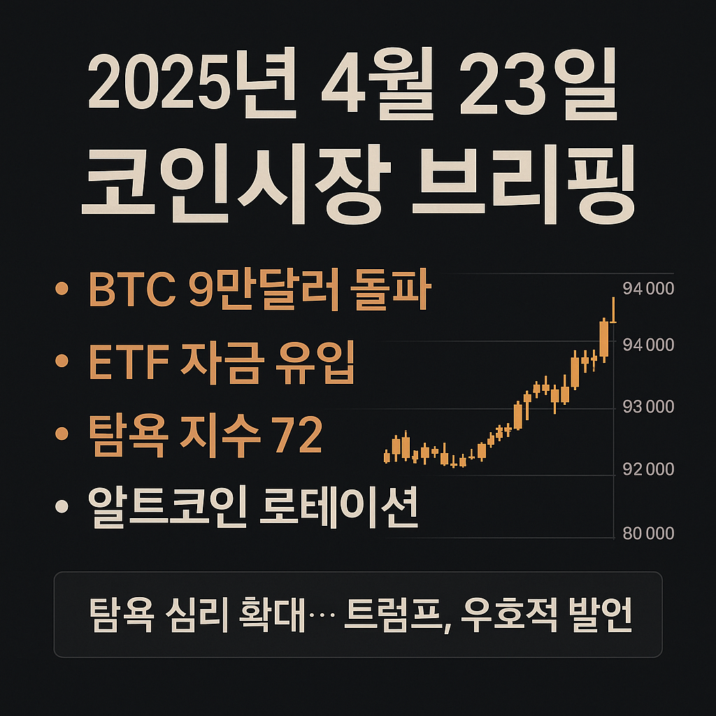 2025년 4월 23일 코인시장 브리핑: 비트코인 9만 달러 돌파와 ETF 자금 유입