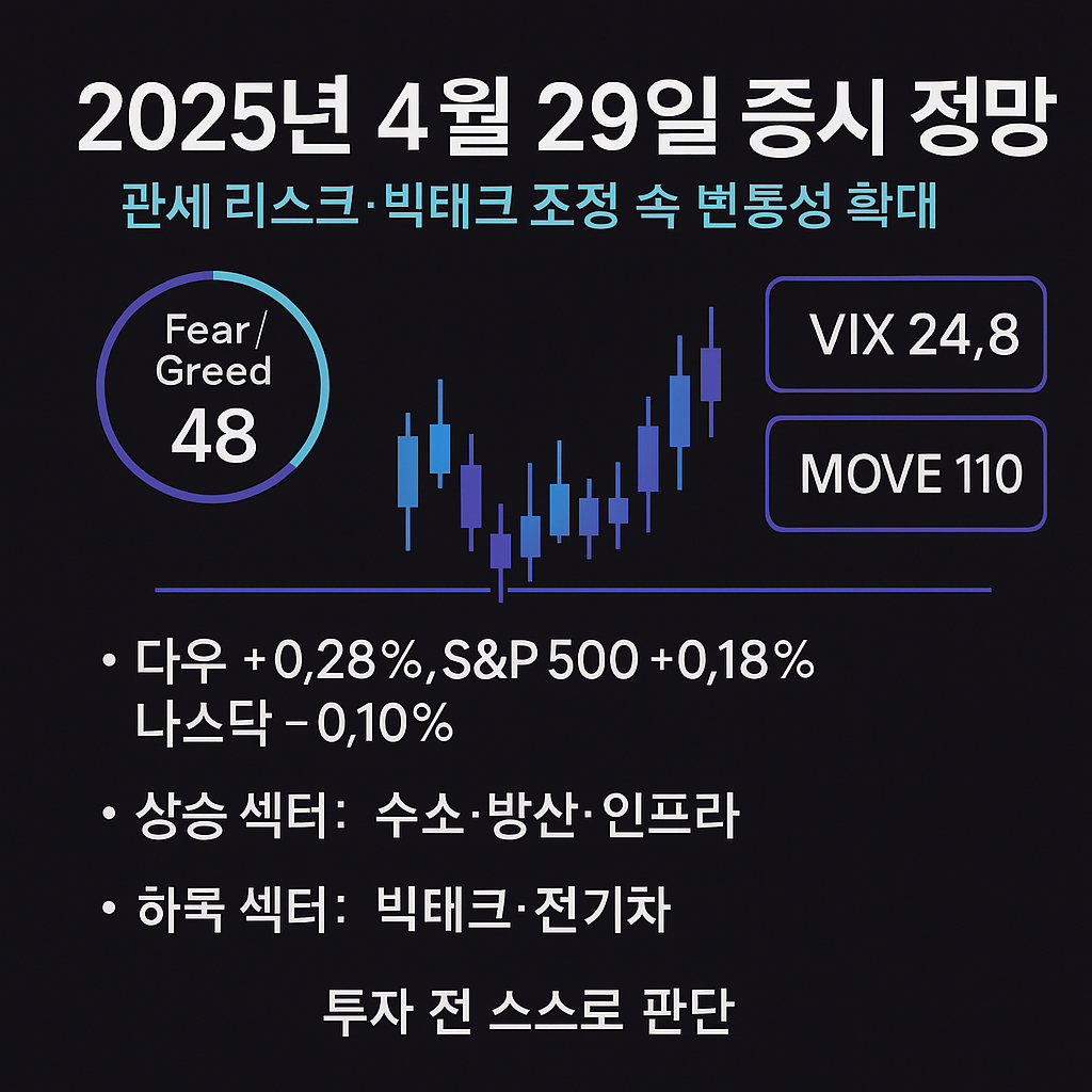 4월 28일 미국 증시는 무역 관세 리스크와 대형 기술주 실적 우려로 하락 마감했습니다. 하지만 수소와 방산, 인프라 관련주는 강세를 보였고, 4월 29일에는 공포·탐욕지수 및 VIX 등 시장 심리 지표를 주시하며 변동성 장세가 예상됩니다.