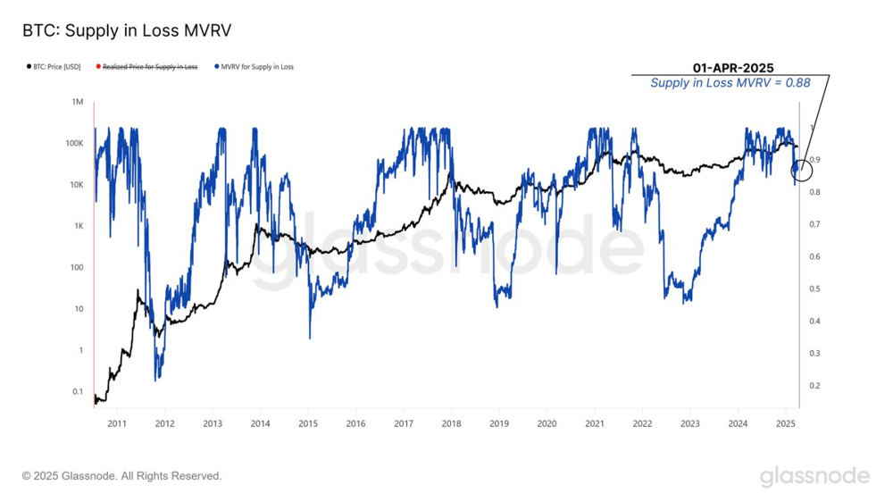 글래스노드 보고서에 따르면 비트코인의 공급 MVRV 비율(시가총액 대비 실현가치)이 0.88까지 떨어졌다.
