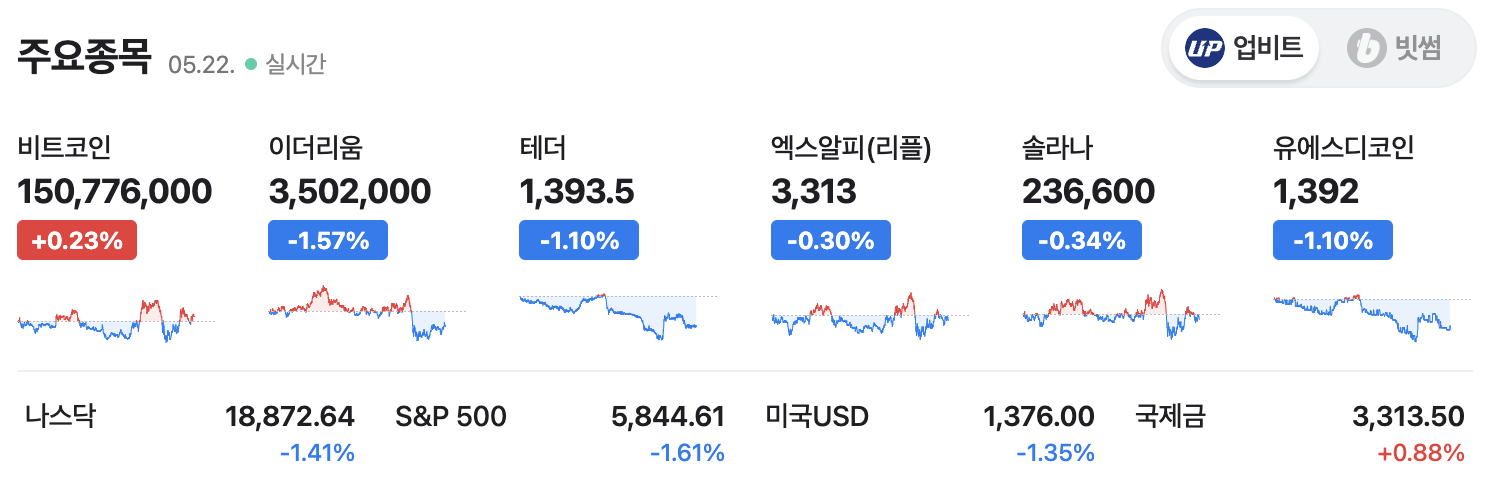 주요 암호화폐 시세 (5월 22일 오전, 업비트 기준)