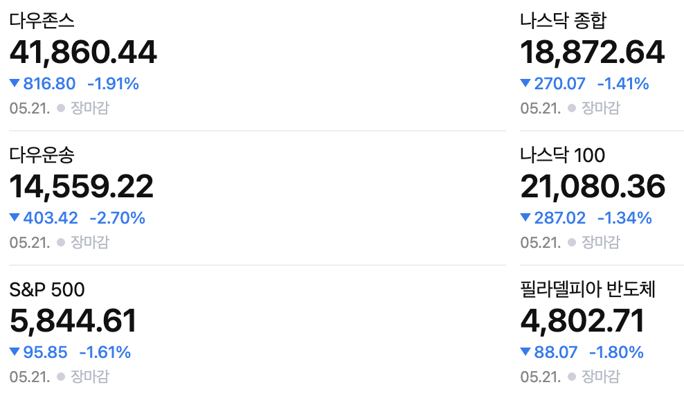5월 21일 미국 증시 주요 지수 (전일 종가 기준)