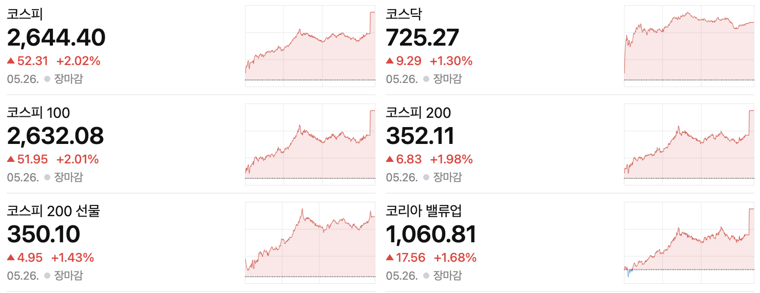 | KOSPI 코스피 | 2,644.40 | +2.02% |