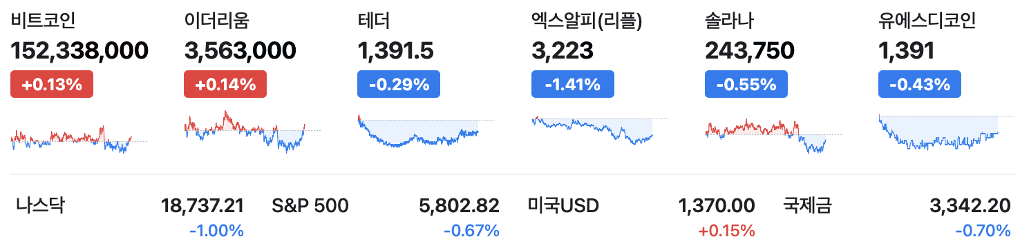 - 국내 시장: 코스피·코스닥 지수 급등과 함께 국내 투자 심리가 개선되었습니다. 비트코인은 한때 1억5200만원선을 유지하며 관망세를 보였고, 김치 프리미엄이 2% 수준까지 상승해 국내 시장 열기를 반영했습니다.
