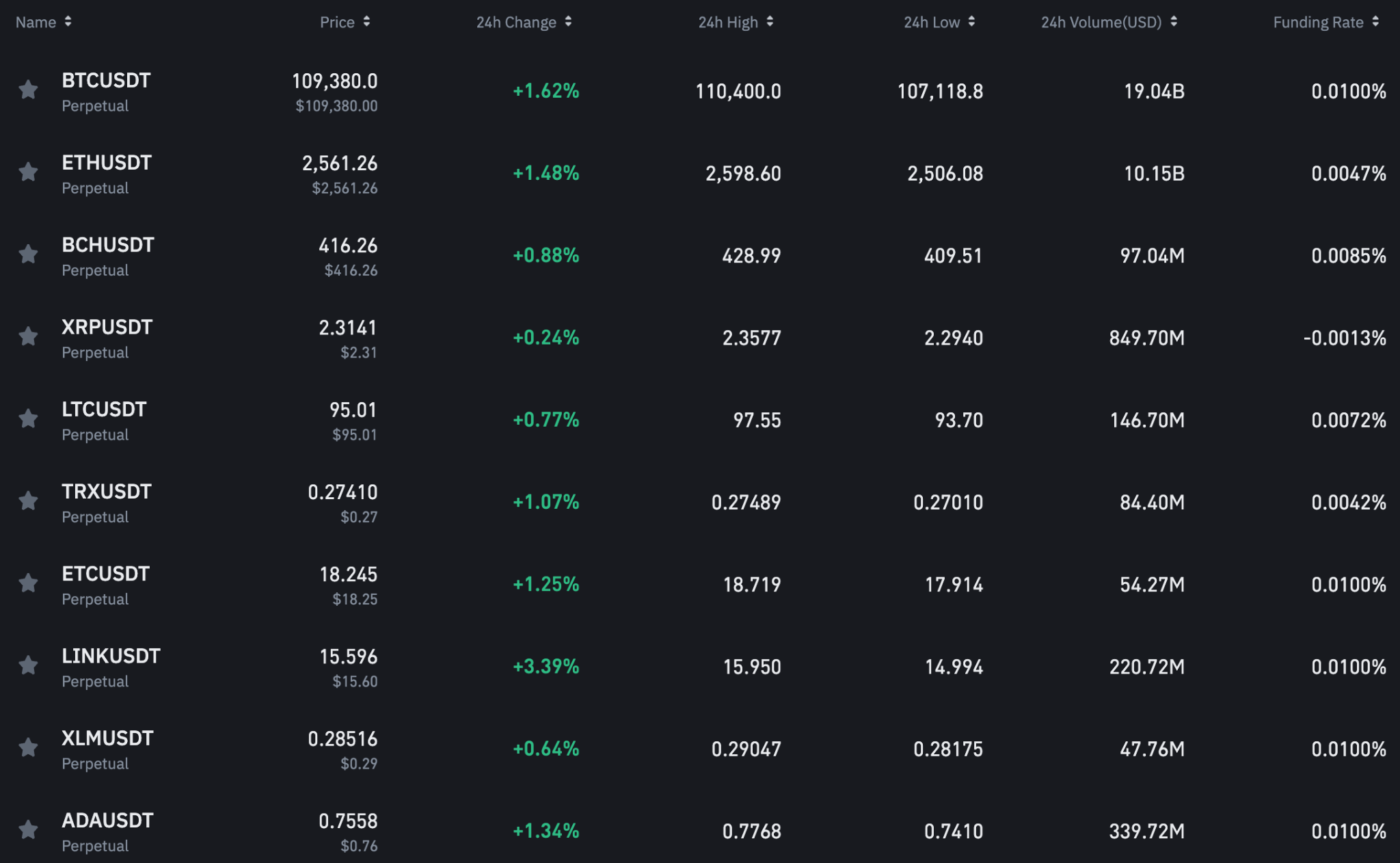 글로벌 거래소 바이낸스 선물 데이터 (5월 27일 오전 기준) – BTC, ETH 등 주요 코인의 24시간 변동률은 +0.5~+1.5% 수준의 완만한 상승을 보였다. 특히 LINK, ADA 등이 3%대 강세를 기록했다. 24h 거래량은 BTC 약 190억 달러로 매우 높으며, 펀딩비는 대체로 +0.01% 내외로 중립적 롱 우위를 시사한다.
