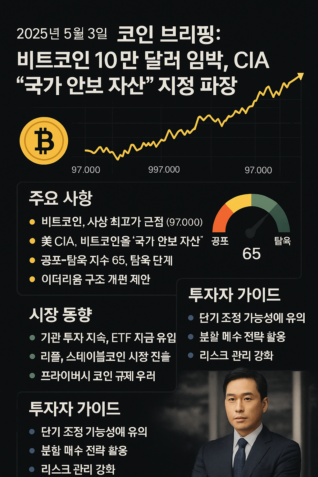 | 2025년 5월 4일, 5일 코인(암호화폐) 브리핑: 비트코인 10만 달러 돌파 임박? (6) | 2025.05.05 |
