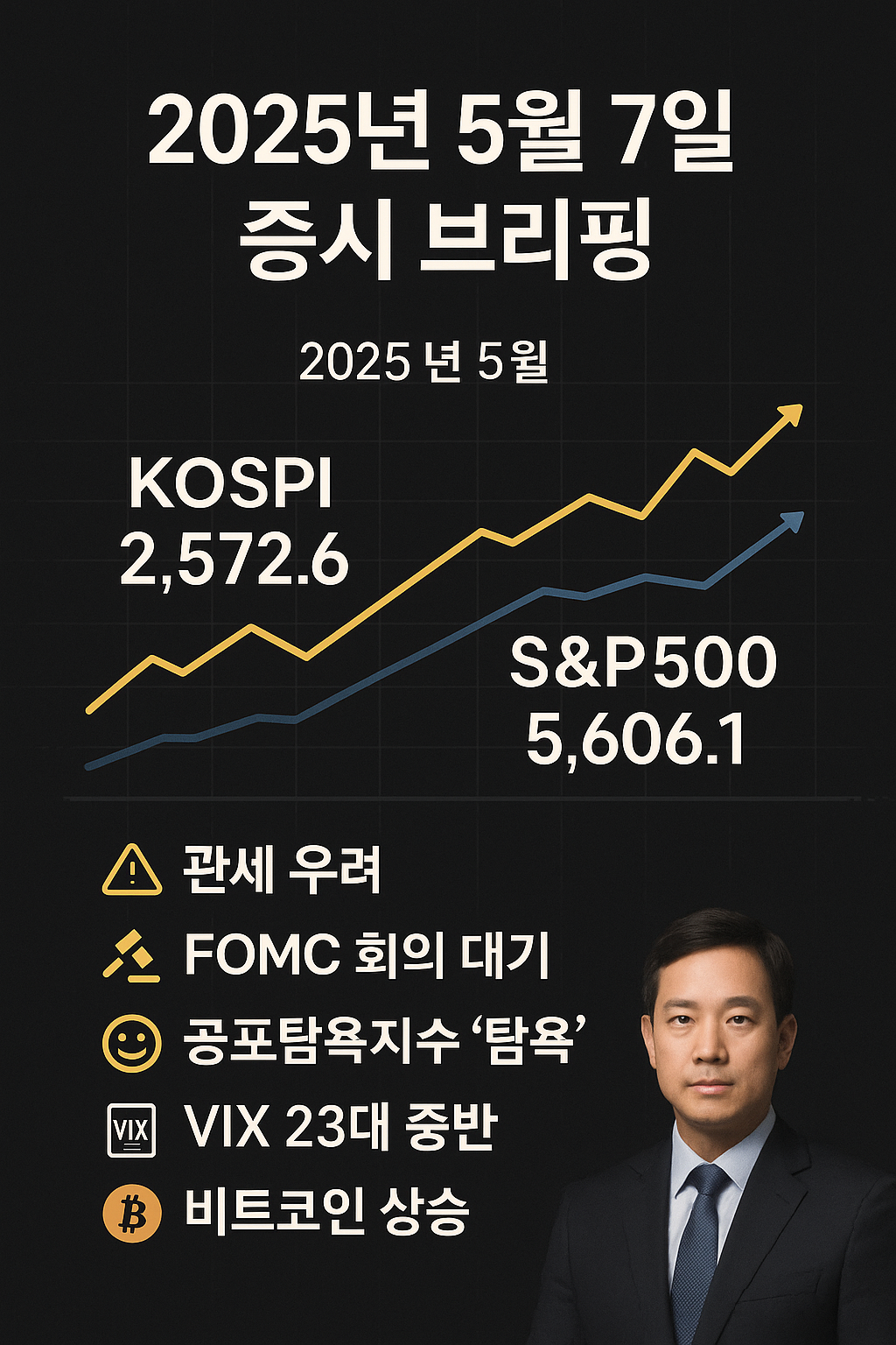 2025년 5월 7일 오전 국내외 증시는 트럼프 미 대통령의 관세 발언과 연준의 FOMC 금리결정을 앞두고 경계 모드가 이어질 전망이다. 미국 장기채 금리가 10년물 4.31%·30년물 4.81% 수준으로 안정되고 VIX(변동성지수)가 23대 중반에 머무는 가운데, 연준은 예상대로 기준금리를 동결할 가능성이 높아 투자심리는 다소 안도하고 있다. 다만 공포·탐욕지수(Fear & Greed Index)가 최근 ‘탐욕’ 단계로 전환된 점과 미 비트코인 ETF의 지속적인 자금 유입(3주 연속, 누적 402억달러)은 위험자산 선호 심리가 되살아나고 있음을 시사한다. 5월 7일 증시는 이러한 복합 변수를 반영해 제한된 범위 내에서 방향성을 모색할 것으로 보인다.